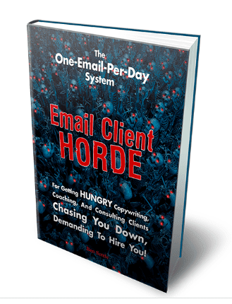 • A sneaky marketing trick (used by wealthy food companies) that can potentially make yourself the only copywriter clients want to hire. (For example: I had a $30 million per year business owner client who might have made a lot more money had he tested other copywriters against me. But he refused. Why? It’s certainly not because of my sparkling personality! No, it is because the way my methodology for getting clients works made him only want to deal with me and nobody else.) Page 46