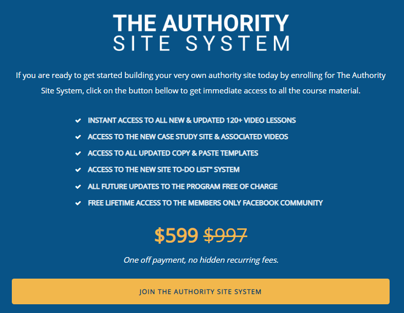 If you are ready to get started building your very own authority site today by enrolling for The Authority Site System, click on the button bellow to get immediate access to all the course material.