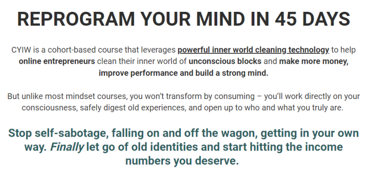 CYIW consists of 5-weeks of C.L.E.A.N Training, 45-days of real inner work directly on your consciousness using THE DAILY PRACTICE with group accountability & weekly check-in calls for the duration of the cohort.