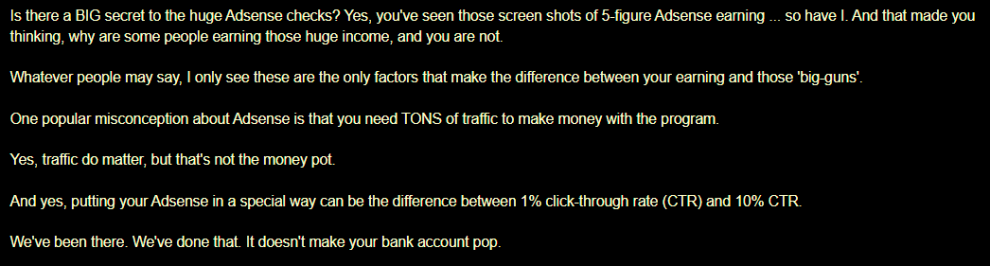 Is there a BIG secret to the huge Adsense checks? Yes, you’ve seen those screen shots of 5-figure Adsense earning … so have I. And that made you thinking, why are some people earning those huge income, and you are not.